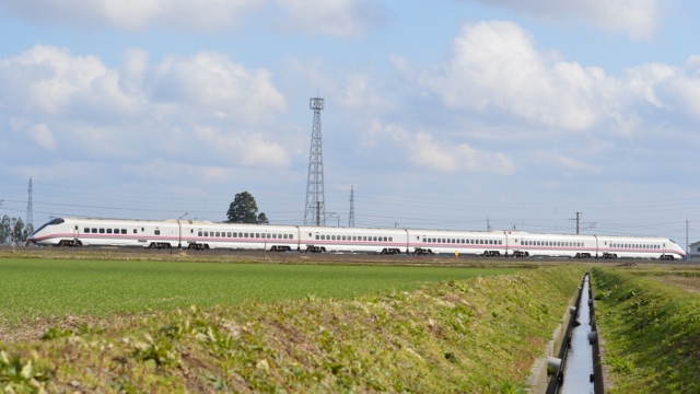 | 上り二番の「スーパーこまち」。 全7両の車両が写るように遠くから撮影。 若草の緑の圃場。 @1446 |